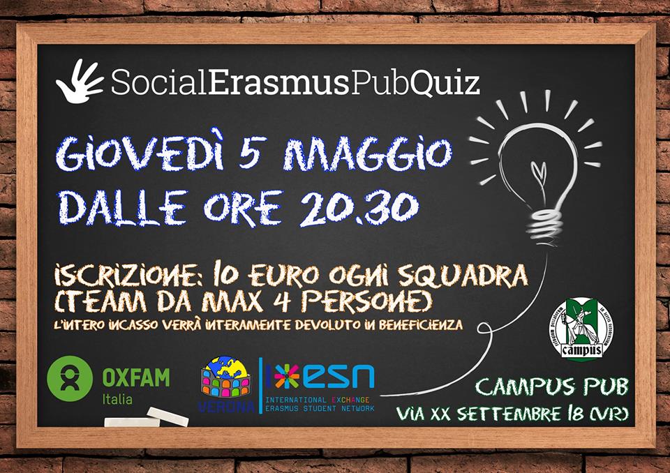 From 8.30PM to 10PM there will be the amazing Pub Quiz by Ase Esn Verona! The price il 10€ per team (max 4 people) and you can subscribe in the office or by texting your favourite ESNer! :D Great prizes for the first three teams! THE PROCEEDS FROM THE QUIZ WILL ENTIRELY BE DONATED IN CHARITY TO Oxfam Italia!