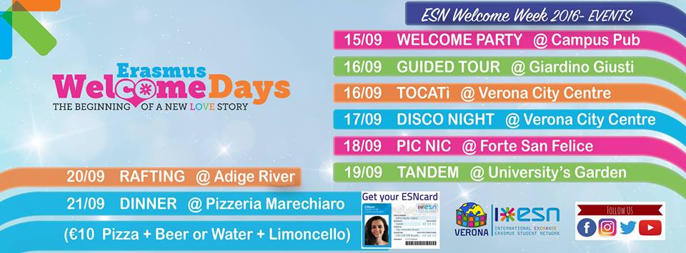 Are you ready for the welcome week? From September the 15th to the 21st, ESN organizes the welcome days for the erasmus students in Verona!